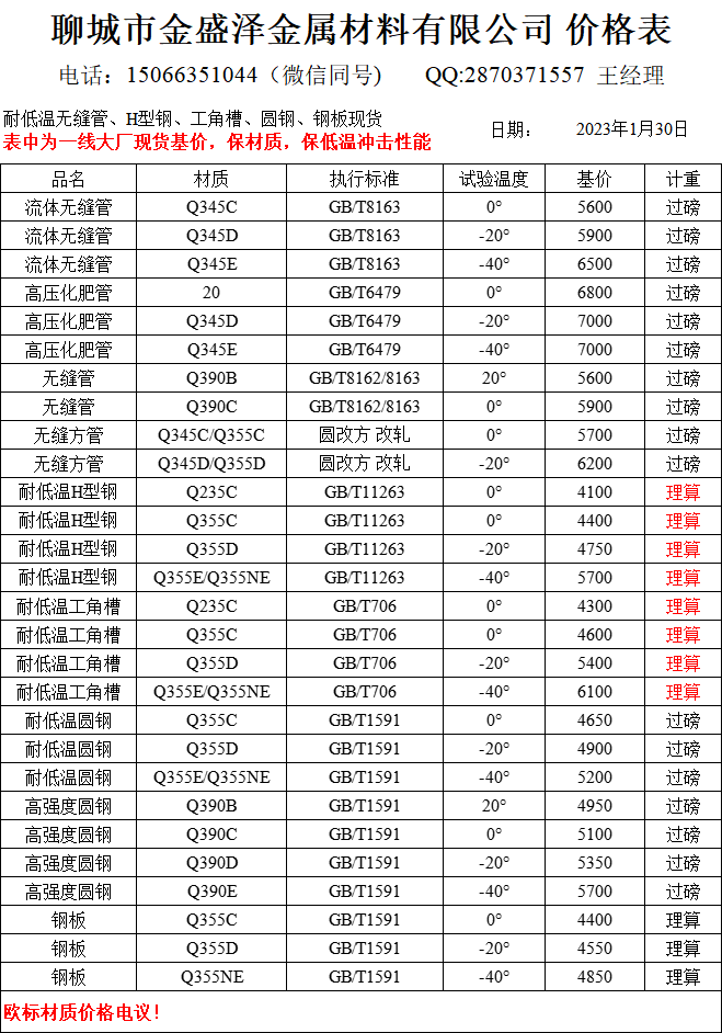 聊城市金盛澤金屬材料有限公司主營低合金/耐低溫無縫管,方矩管,H型鋼,工字鋼,角鋼,槽鋼,圓鋼,鋼板;現(xiàn)貨供應:大無縫、包鋼、煙寶、鳳寶正品耐低溫無縫管,專業(yè)加工生產(chǎn)無縫方矩管;經(jīng)營一線品牌型材:萊鋼/包鋼/馬鋼/日鋼 耐低溫Q235B/C;Q355B/C/D/NE H型鋼(100*100-1000*300) 偏型號H型鋼鋼現(xiàn)貨:250/255,248/124,344/348,394/398,506/201,606/201,458/417,912/302,692/300,792/300 ;萊鋼/馬鋼/宣鋼產(chǎn) 耐低溫槽…